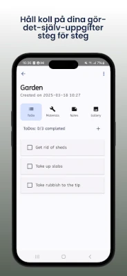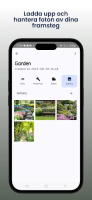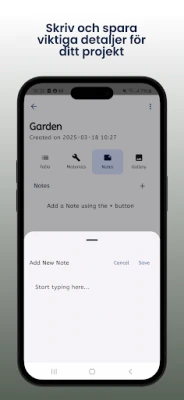 Inga fler borttappade anteckningar eller osorterade foton! Denna app centraliserar all viktig information. Spara detaljerade instruktioner, skisser eller plötsliga insikter direkt i den dedikerade anteckningsfunktionen. Dokumentera dina framsteg visuellt i fotogalleriet, där du enkelt kan ladda upp bilder som visar projektets utveckling, samla inspiration för framtida verk, eller stolt visa upp det färdiga resultatet. Varje bild blir en del av din projekthistoria, säkert förvarad och lättillgänglig.