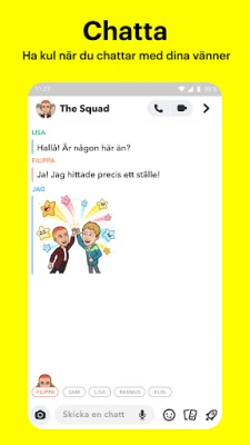 Håll dina vänskapsband starka genom Snapchats mångsidiga kommunikationsverktyg. Skicka livemeddelanden som håller konversationen igång, eller dela delar av din dag med Grupp-Stories för att uppdatera alla samtidigt. Förvandla avståndet till närhet med videochattar för upp till 16 deltagare, där ni kan förstärka stämningen med lekfulla linser och filter. Uttryck era unika band med Friendmojis – Bitmojis skapade specifikt för dig och en vän – och följ med i vänners Stories för att se vad de har för sig.